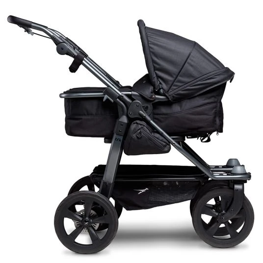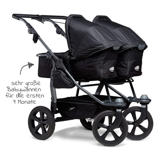 Der Geschwister- und Zwillings-Kombi-Kinderwagen Duo – Schwarz mit 2 Babywannen, die zu Sportsitzen umbaubar sind, ist die konsequente Weiterentwicklung der bewährten TFK-Klassiker Twin Trail und Twin Adventure. Wie bei seinen Vorgängern werden auch hier Qualität und Sicherheit großgeschrieben.