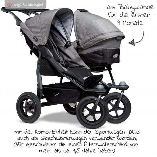 Die Kombi-Einheit für den Geschwister- & Zwillingssportwagen Duo – Braun ermöglicht die Nutzung Deines Kinderwagens Duo ab der Geburt. Mit der Kombi-Einheit können Geschwister die einen Altersunterschied von mehr als 1,5 Jahre haben, zusammen fahren. Ab der Geburt bis zu ca. 9 Monaten liegt das Geschwisterchen erst in der Babywanne und wenn es sitzen kann, baust Du die Babywanne zum Sportsitz um und beide können nebeneinander sitzen.