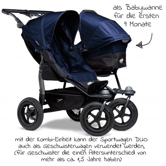 Die Kombi-Einheit für den Geschwister- & Zwillingssportwagen Duo – Marine ermöglicht die Nutzung Deines Kinderwagens Duo ab der Geburt. Mit der Kombi-Einheit können Geschwister die einen Altersunterschied von mehr als 1,5 Jahre haben, zusammen fahren. Ab der Geburt bis zu ca. 9 Monaten liegt das Geschwisterchen erst in der Babywanne und wenn es sitzen kann, baust Du die Babywanne zum Sportsitz um und beide können nebeneinander sitzen.