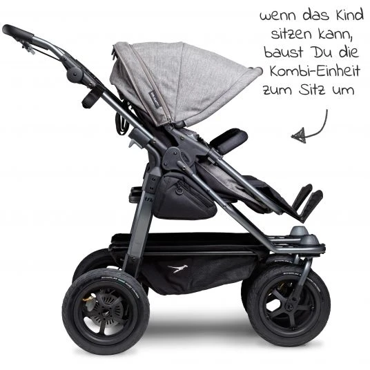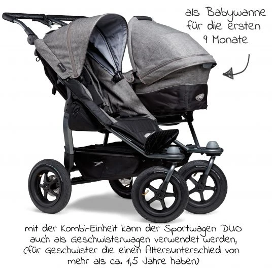 Die Kombi-Einheit für den Geschwister- & Zwillingssportwagen Duo – Premium Grau ermöglicht die Nutzung Deines Kinderwagens Duo ab der Geburt. Mit der Kombi-Einheit können Geschwister die einen Altersunterschied von mehr als 1,5 Jahre haben, zusammen fahren. Ab der Geburt bis zu ca. 9 Monaten liegt das Geschwisterchen erst in der Babywanne und wenn es sitzen kann, baust Du die Babywanne zum Sportsitz um und beide können nebeneinander sitzen.