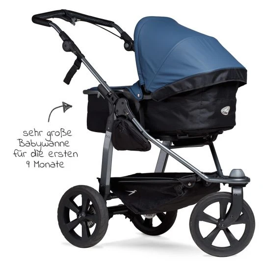 Er ist ein verlässlicher Allrounder und dank großer, pannensicherer Luftkammerräder 12 Zoll (30 cm) auf nahezu jedem Terrain einsetzbar. Nicht nur beim Wandern sondern auch beim Bummel durch die Stadt macht der Kombi eine gute Figur. Komfort für Kind und Eltern wird hier nämlich großgeschrieben – und das von Anfang an. Im Set enthalten ist eine umbaubare Wanne. Diese innovative Kombi-Einheit (Wanne & Sitz) mit Komfortmatratze zählt zu den größten auf dem Markt. Du kannst sie sowohl in als auch entgegen der Fahrtrichtung aufsetzen und zu einem vollwertigen Sportsitz mit 5-Punkt-Gurt umbauen. So kommen auch kleine Mitfahrer, die schon selbstständig sitzen können, voll auf ihre Kosten.