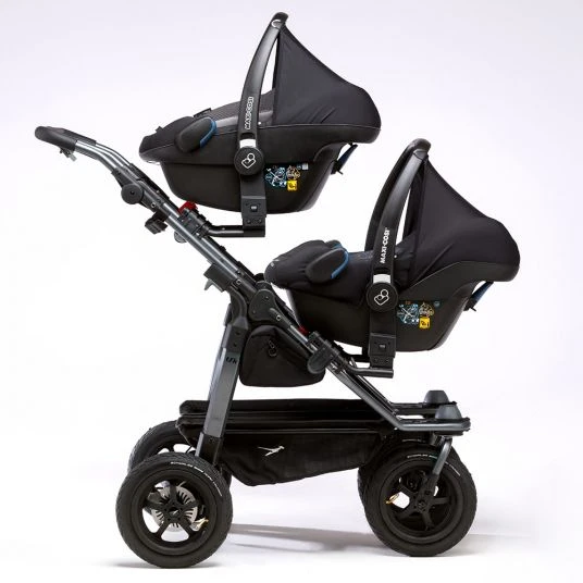 Mit dem Maxi-Cosi / Cybex / Joie Adapter kannst Du Deinen Geschwister- und Zwillingskombikinderwagen Duo ab der Geburt in Kombination mit zwei Babyschalen nutzen. Dazu befestigst Du den Adapter auf dem Gestell. Anschließend werden die Babyschalen aufgesetzt. Als praktisches Shop’n-Drive-System eignet sich die Kombination bestens für Autofahrten und Einkaufstouren. Die schlafenden Babys hebst Du in der Babyschale einfach aus dem Fahrzeug und setzt sie auf das aufgeklappte Gestell. So kannst Du sofort weiterziehen, ohne Deine Kleinen aufwecken zu müssen. Außerdem sparst Du eine Menge Platz, da Du keine Babywanne mehr mitnehmen musst.