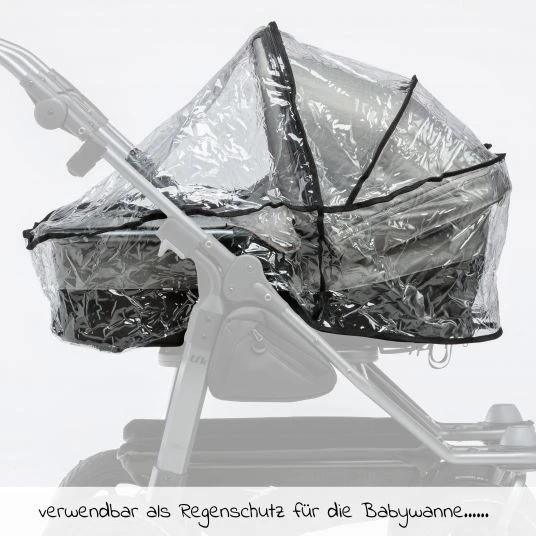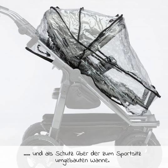 Der Regenschutz sitzt passgenau. Für einen guten Luftaustausch ist dabei stets gesorgt. Du kannst das Verdeck ebenso lange einsetzen, wie Du Deinen Kinderwagen verwendest (36 Monate) – er passt sowohl über die Wanne als auch über den umgebauten Sportsitz. So ist auch der Spaziergang bei schlechem Wetter ein Kinderspiel.