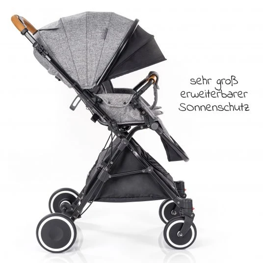 Der Buggy kann insgesamt ein Gewicht von bis zu 22 kg tragen, lässt sich in der Liegeposition aber auch schon ab der Geburt verwenden. Seine großen Weißbandräder kommen problemlos durch enge Wege und leichtes Gelände. Perfekt für das hektische Stadtleben mit Bus und Bahn oder den nächsten Strandurlaub.