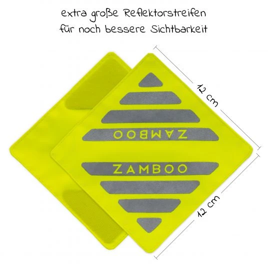 Die Kinderwagen Reflektoren von Zamboo, in knalligem Neon-Gelb mit reflektierenden Streifen, sind schnell für andere Verkehrsteilnehmer zu entdecken.