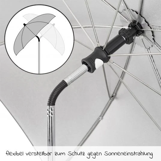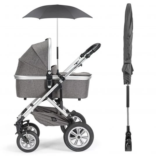 Du kannst den Schirm an jedem Kinderwagen oder Buggy befestigen. Egal ob dieser runde oder ovale Rohre hat. Solange die Rohre einen Durchmesser von 1,8 bis 3 cm haben, lässt sich der Schirm zuverlässig befestigen. Die Innenseite der Halterung ist gummiert. Dadurch bleibt der Schirm an Ort und Stelle und Dein Kinderwagengestell verkratzt nicht. An Tagen ohne Sonne klickst Du den Schirm einfach aus – die Halterung bleibt einfach am Gestell.